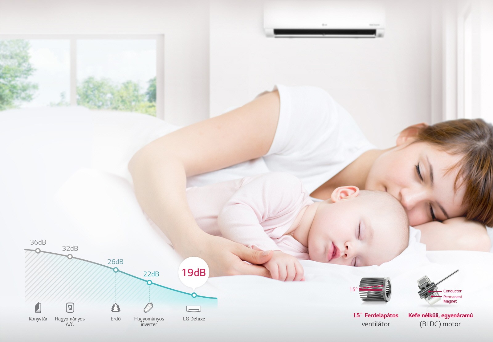 Az LG légkondicionálói alacsony zajszinten működnek az egyedi LG kefe nélküli, egyenáramú (BLDC) motortechnológiának köszönhetően, mely mentes minden felesleges zajtól és zökkenőmentesen üzemel.