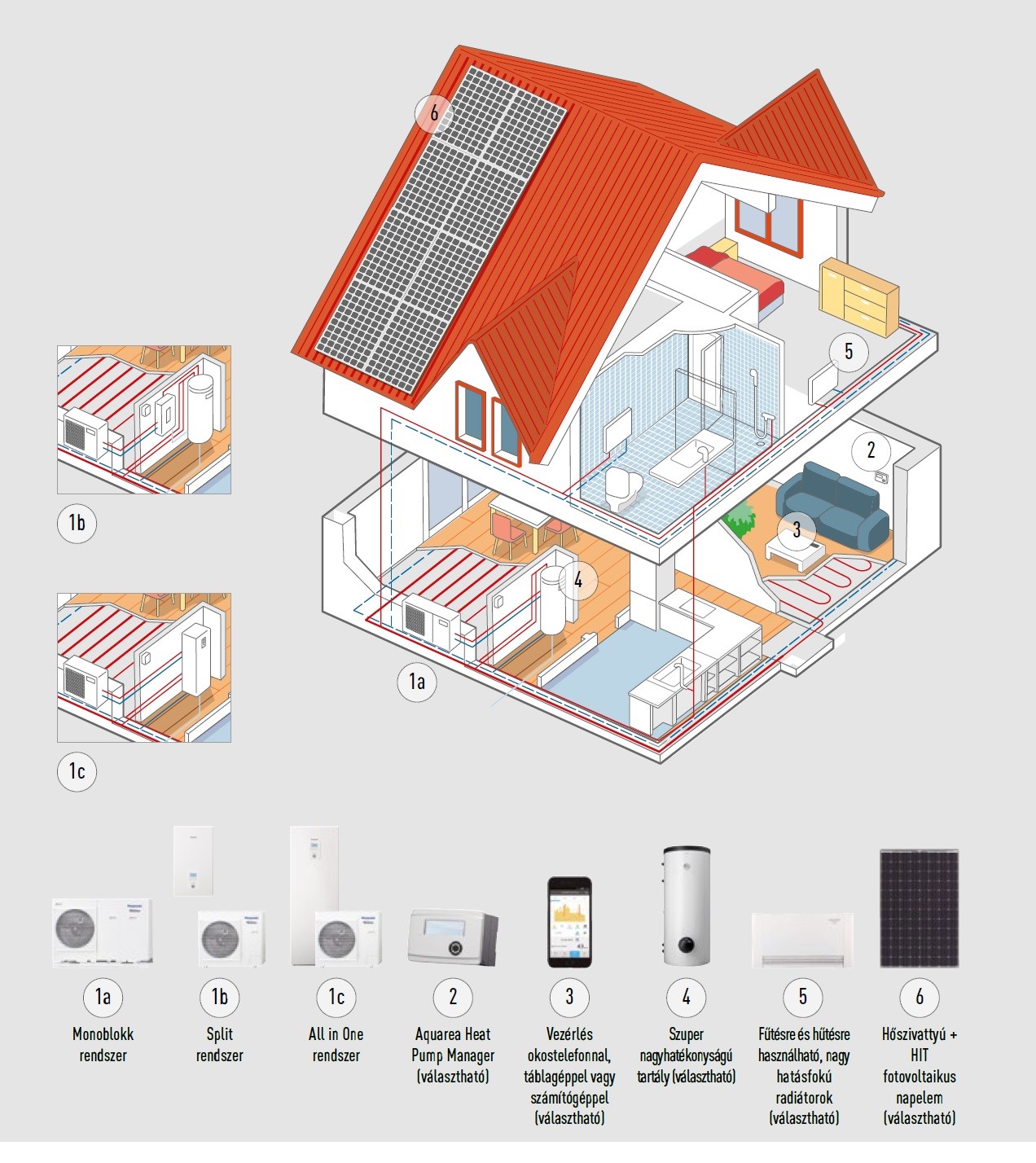 Aquarea levegő-víz hőszivattyú: Innovatív, alacsony energiaigényű megoldás, amely szélsőséges külső hőmérséklet mellett is kiemelkedő kényelmet teremt a lakóépületekben. Biztosítja a radiátorok, a padlófűtés és a fan-coil egységek számára szükséges hőmennyiséget és használati meleg víz előállítását.